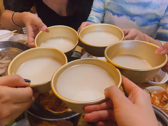 米酒是优秀的肉类搭档,大米和大麦混合发酵而成的韩式饮品,和中式的醪糟味道很不一样,用韩剧同款黄铜碗喝特别有气氛,入口顺滑浓郁,饮后还有一丝丝回甜,非常解腻。