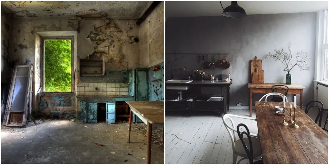 对比一下,以前的侘寂风房子其实是日本僧人的小茶室,小而破旧,得弯着腰才能钻进去,物质贫乏,精神富足。而现代侘寂风,基本都是大空间,也很敞亮,看似清贫,其实都蛮“费钱”的。▼