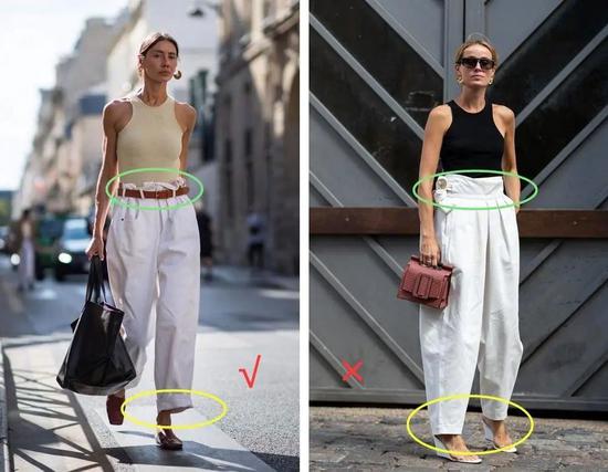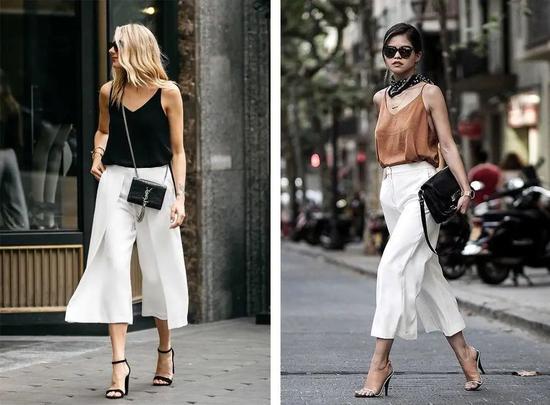 不过今天我要说的,不是白色长裤应该配什么样的上装,而是平常极其容易被大家忽视的鞋子问题!类似的白色阔腿裤,只是在腰头和裤脚有细微的区别,给人的感觉却差了不少。
