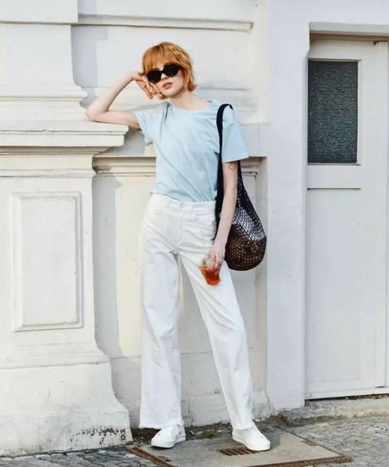 比起紧身裤对腿型的挑剔,直筒裤就包容了许多,笔直的裤管还能起到修饰腿型的作用,利用小白鞋在视觉上拉伸下半身线条,连显高的效果都出来了。