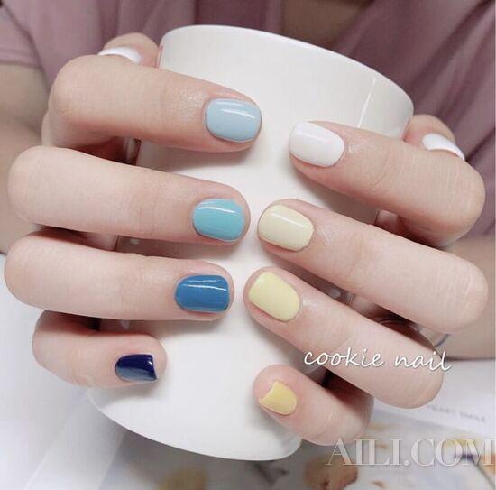 每个指甲的颜色都不同,打造出不同的渐层色系美甲,可以把家里的指甲油都拿出来搭配在一起,会有意想不到的效果。