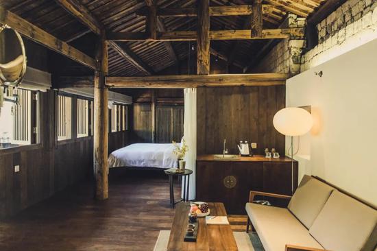 行馆占地有5.5亩,却仅有26间,包含3种房型,面积在34-69平米不等。客房室内设计简约古朴,地板、家具、天花板都是实木,一派冷清又原始的氛围。本次春节小团前4间报名的客人,还可享受早鸟礼遇,免费升级房型至55-69平的睡乡山景房。