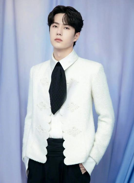 小晞与白色的适配度非常高,一身白色西装的他,化身翩翩白衣公子,优雅迷人。内搭的丝质黑衬衫柔软舒适,简约又时髦。