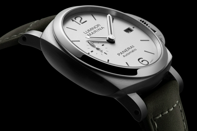 庐米诺系列腕表44毫米(PAM01314)采用简约的白色三明治式表盘,搭配Luminor经典表冠护桥,绿色夜光显示。