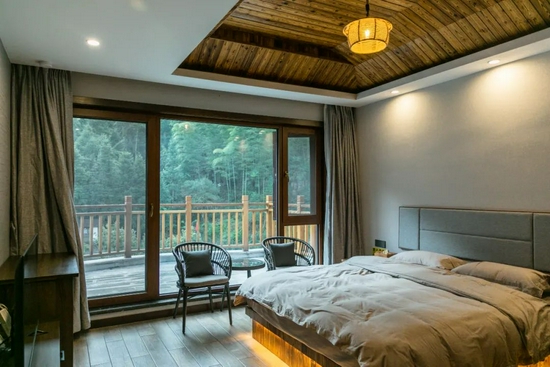中式风格的房子与外面的风景一脉相承,房间内的树木都是真实从泥土里拔地而起,原木与竹将这山中小屋装点的素朴洁净。