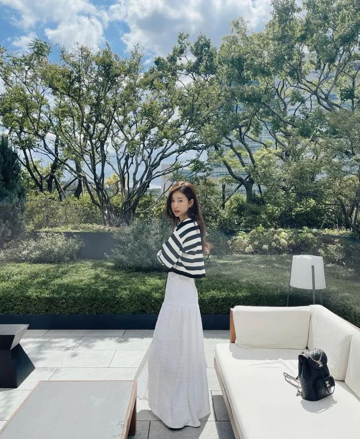 好久不见的万茜用条纹针织+修身半裙做出了秋冬季节的优雅示范,整体修身的设计让曼妙的曲线在条纹的包裹下尽情舒展。深秋之后,外搭大衣也能成立。