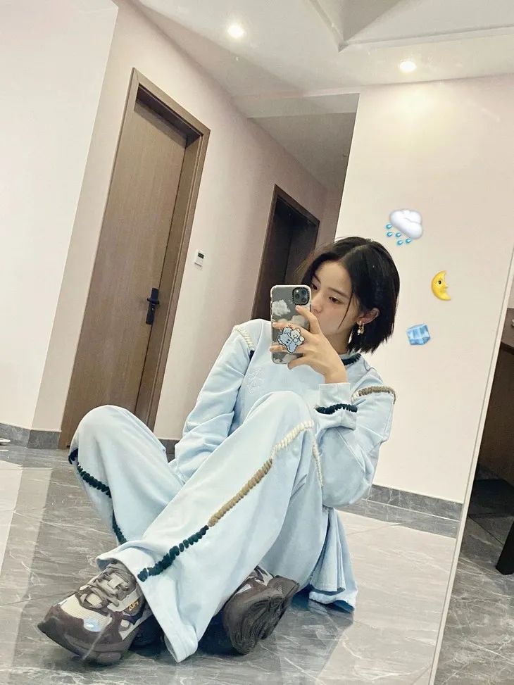 回归OOTD队伍的欧阳娜娜以一套JW Anderson淡蓝色运动套装演绎舒适的居家冬日。