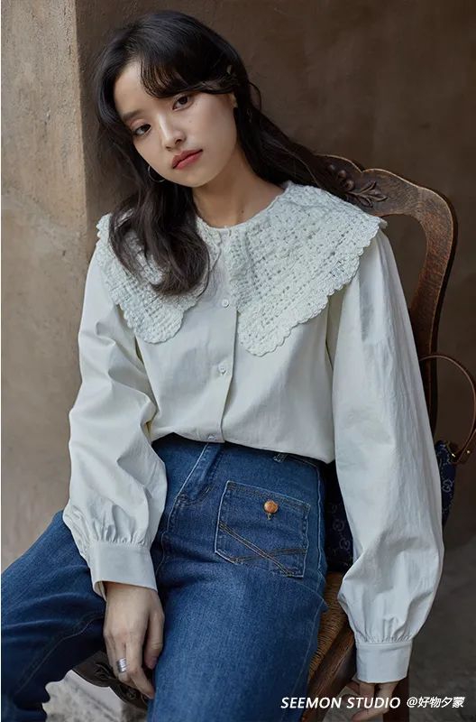 推荐理由:搭配牛仔裤是相对比较简单的,这件衬衫是超大娃娃领的设计,不推荐小个子哦,会有点压身高,喜欢牛仔裤的可以闭眼买,设计复古时髦兼具,搭配一双小皮鞋,轻松出街!