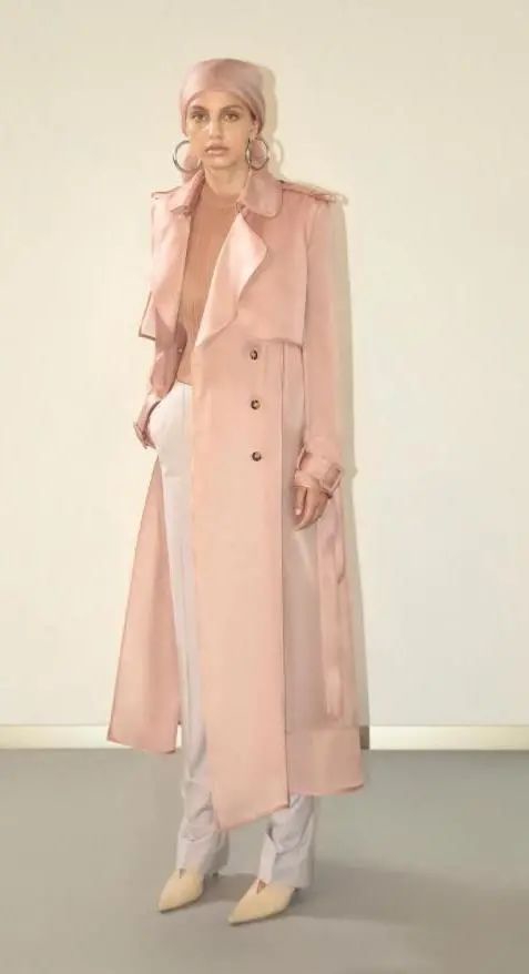 不喧闹的裸粉加上丝滑的绸缎面料,自带平和力量感。Sofya身上这件薄风衣,谁看了不说一句温柔又不失千金气质。