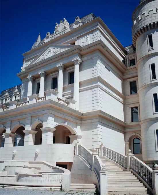 城堡的主体是白色搭配的浮雕,一种欧洲风情瞬间吸人眼球。城堡两侧的灌木丛,就像置身在花园中,拾阶而上,随手就能拍出欧风满满的照片。