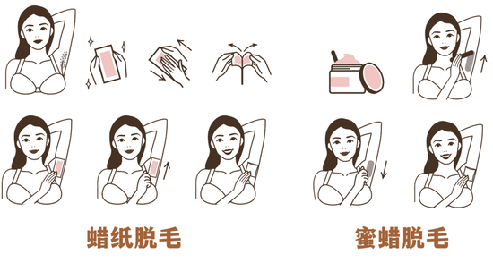 物理脱毛:撕拉式(蜜蜡、蜡纸)、刮剃(刮毛刀)。