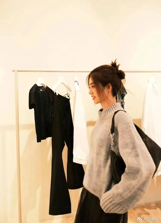 当然,最经典的圆领针织衫无论何时都占据着冬日单品的一席之地。万鹏这件花灰色针织上衣结合钟型袖的设计,足够经典耐看。
