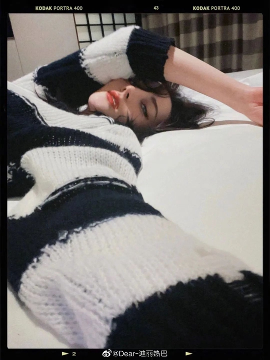 迪丽热巴这件拼接设计,以白色拼接燕麦色条纹针织,整体视觉看起来软糯而明媚,轻松勾勒秋冬氛围。