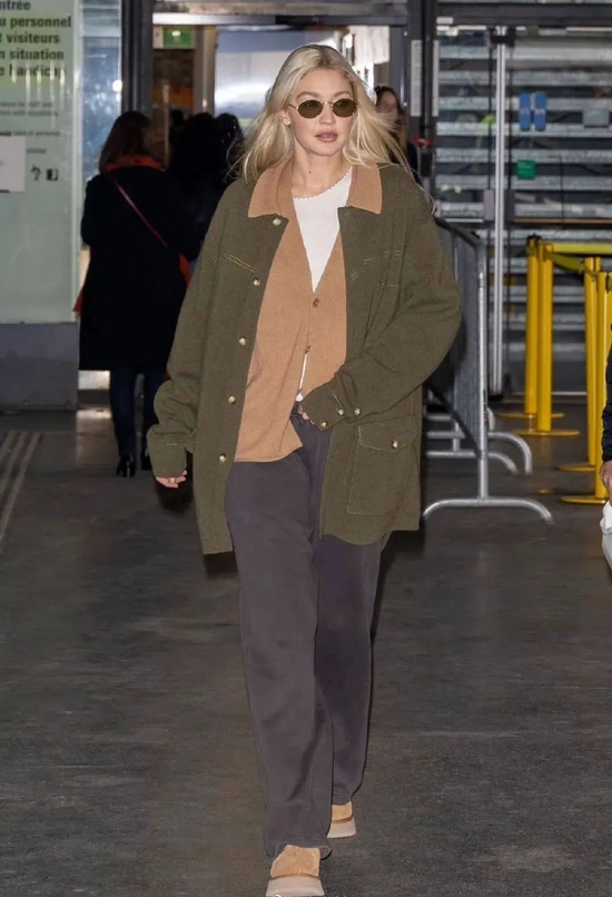 Bella的姐姐Gigi Hadid在今年就成立了自己的羊绒品牌Guest In Residence,姐妹俩都上身过这件无领开衫针织,简约样式轻松穿出不同风格。